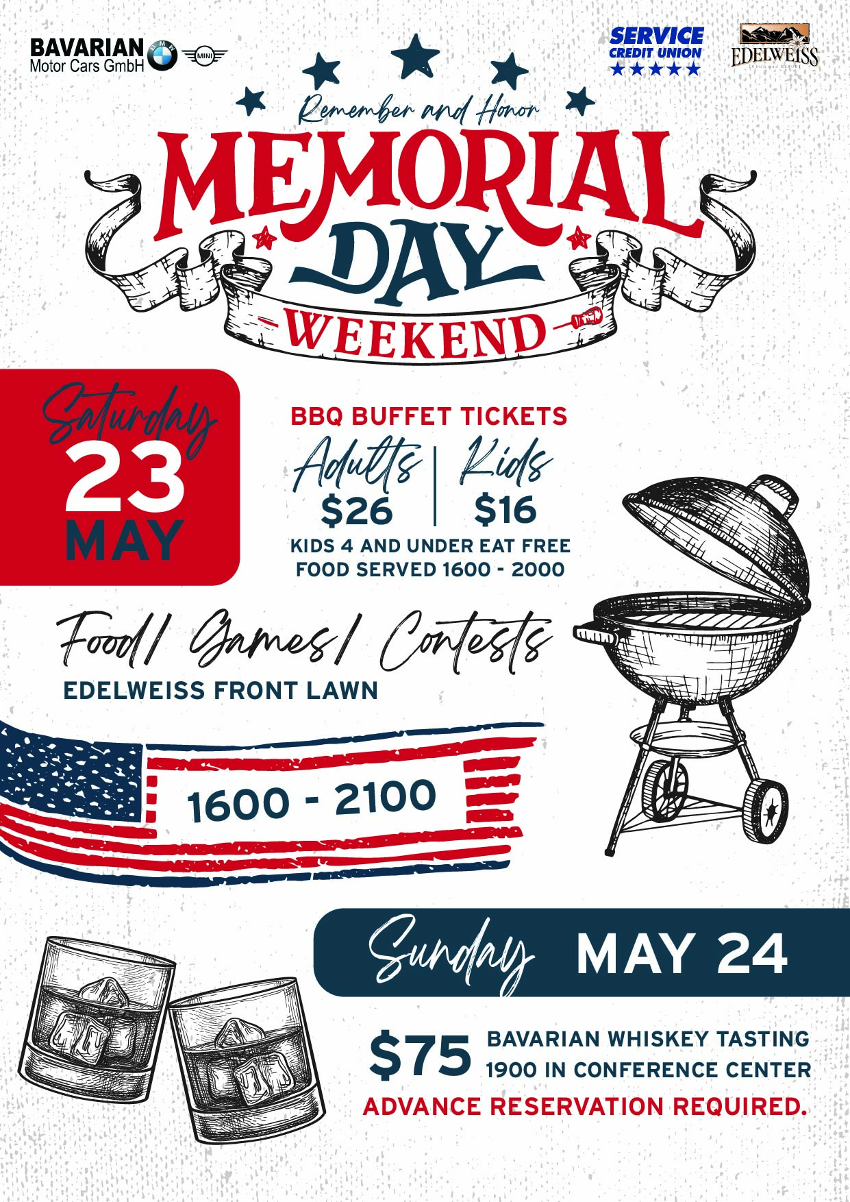 Only a few rooms remain! Memorial Day weekend is a time to remember and honor the sacrifices made by the men and women who serve. Join us in honoring Memorial Day with a weekend full of family activities and events. Bring the whole family and enjoy a Memorial Day weekend BBQ with some of the best views in all of Germany. Let the kids enjoy bouncy castles, games, and contests. Enjoy some great traditional BBQ from our head chef with all the fixings. Relax with the family outside on the front lawn playing games like cornhole, slackline, and playing mini-golf.