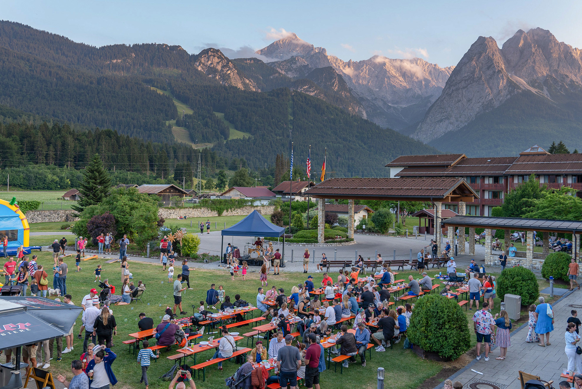 Hog roast, burgers, vegetarian options, hot dogs, desserts. A classic all-American BBQ with the Alps as your backdrop.